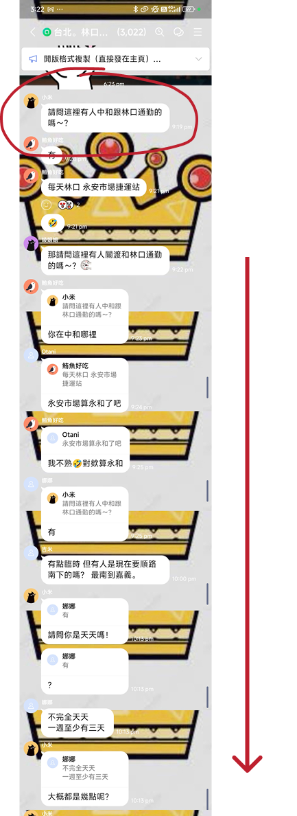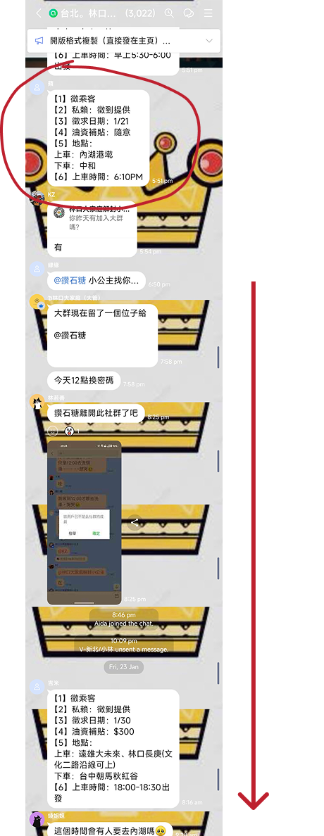 The first is digital. People join LINE groups to post their route, departure time, and fare — then wait for someone to reply. But LINE is fundamentally a chat room. To find a match, commuters have to manually scroll through a mix of posts and unrelated replies, filtering for origin, destination, and time. And because leaving time is rarely predictable, by the time someone posts or finds a match, the ride is often already gone or no longer available.