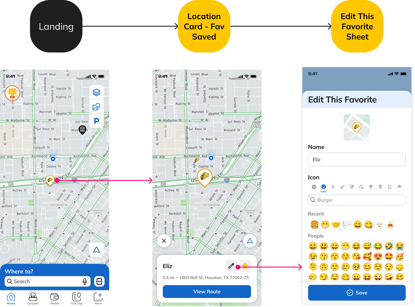 After: User can tap the saved icon on the map to edit their saved location. This also allows them to clearly view the icon they previously selected for that location.