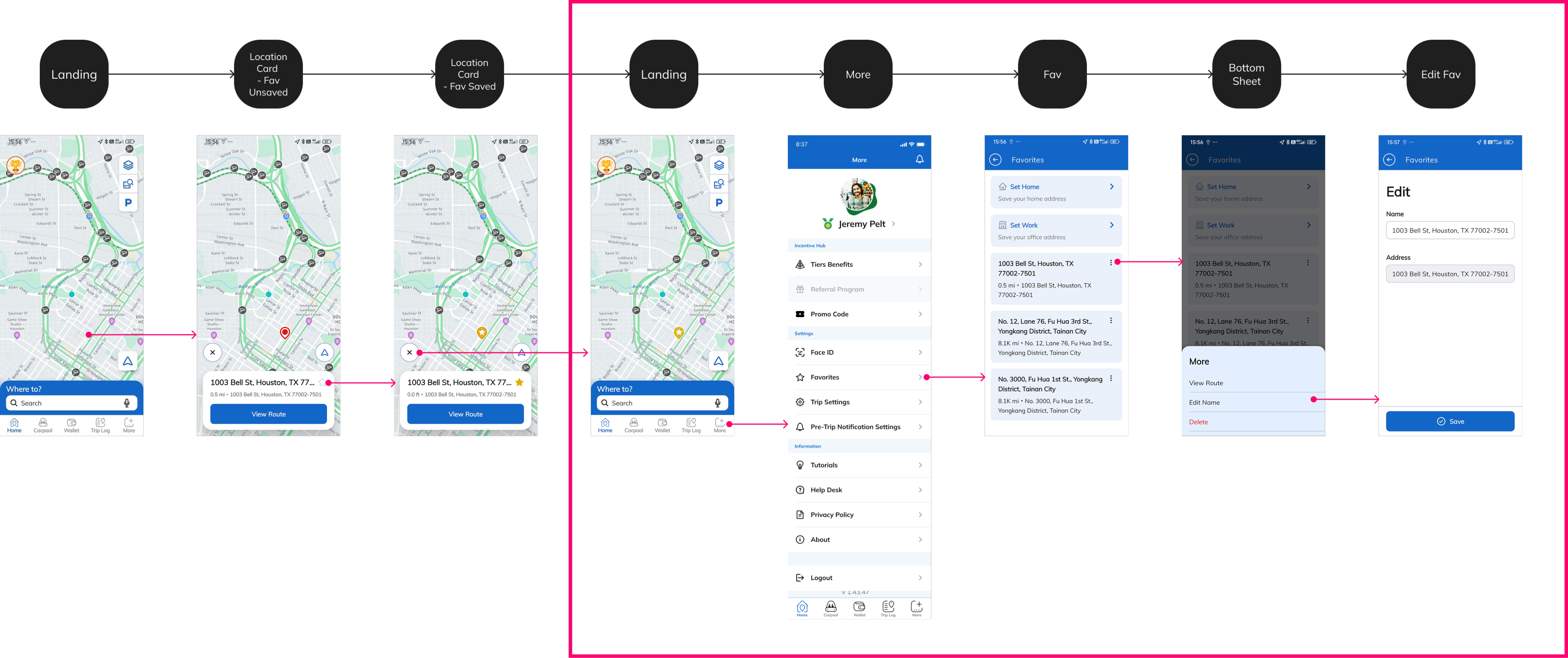 Before: Favorite management is buried deep in the navigation hierarchy. User has to go through 4 steps before they can even access the option to edit a saved location. The interface also only displays text-based information, which provide little visual meaning for users and make it difficult to quickly recognize or distinguish saved places.